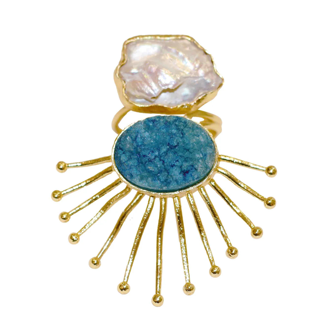 The Spike Ring radiates with a vibrant blue druzy stone framed by golden sunburst spokes, crowned with a baroque pearl that adds a touch of soft, celestial glow. Boldly sculptural and irresistibly expressive, it’s a statement piece for the woman whose light refuses to dim.